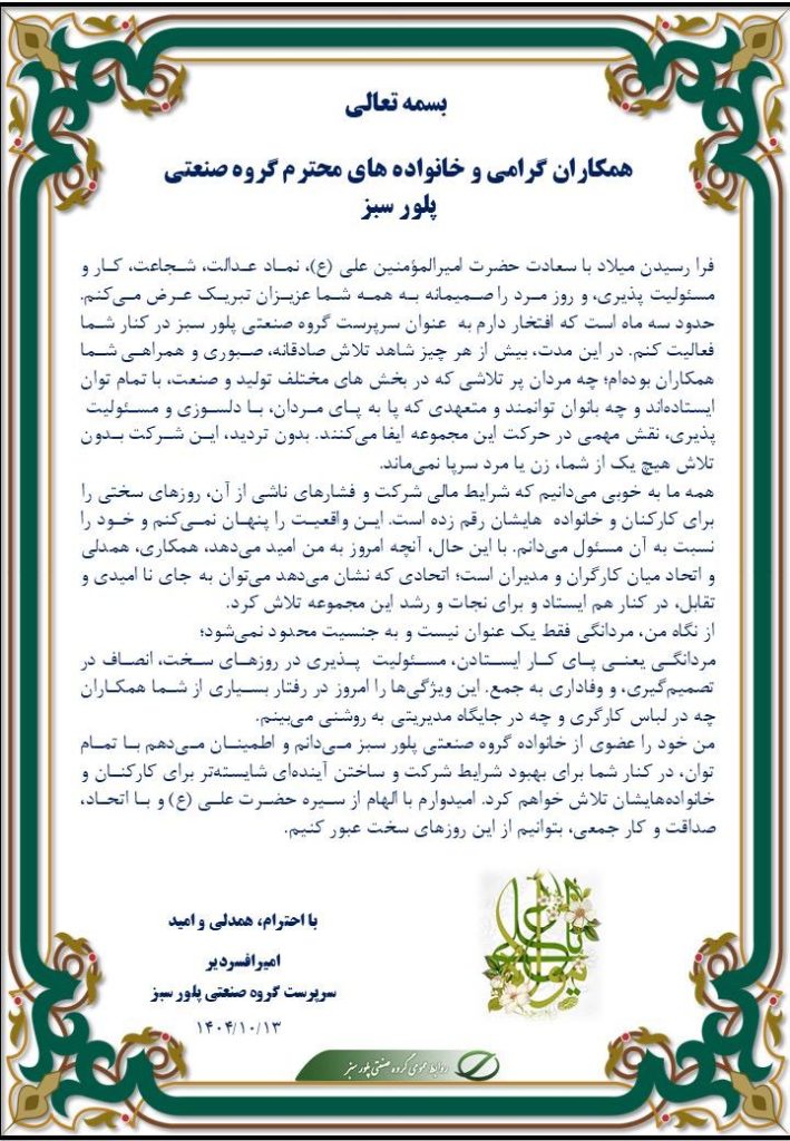 به گزارش روابط عمومی روز شنبه مورخ 22 دی 1403 آقای دکتر محمدعلی طالبی استاندار کرمان به همراه معاون اقتصادی استاندار، نماینده مردم زرند و کوهبنان در مجلس، امام جمعه و فرماندار شهرستان زرند و هیات همراه از کارخانه گروه صنعتی پلور سبز واقع در شهر زرند بازدید کردند.